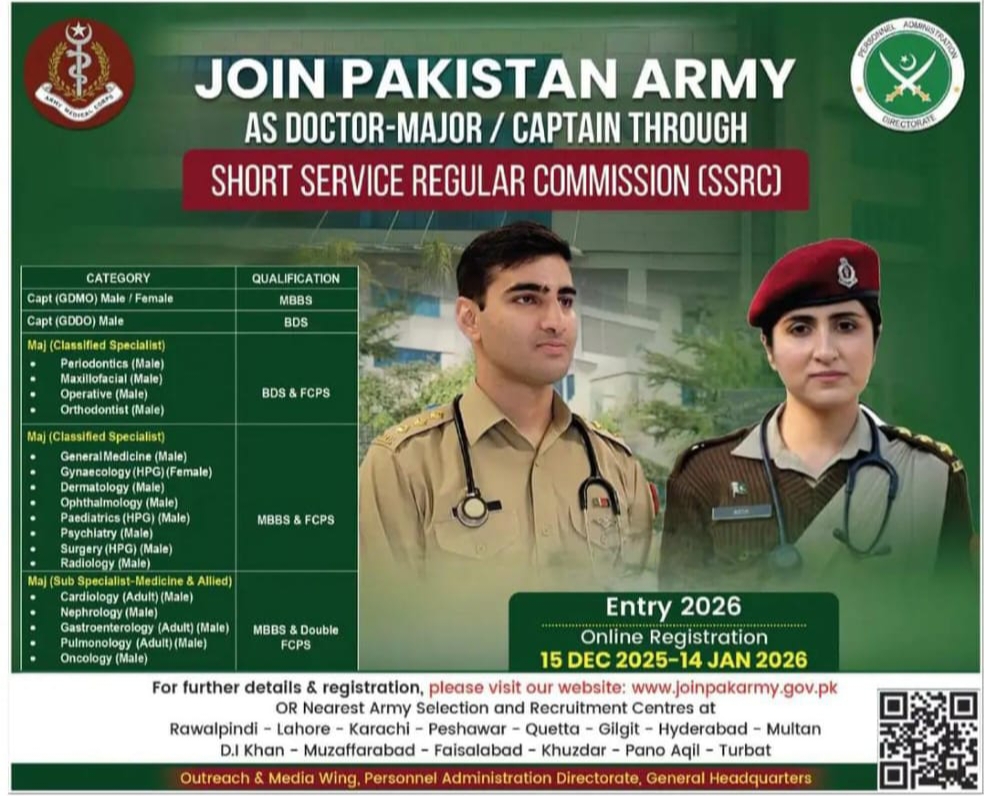 Are you a qualified medical professional dreaming of serving the nation while advancing your career? The Pakistan Army is calling for passionate doctors to join as Doctor-Major/Captain through Short Service Regular Commission (SSRC) for Entry 2026. This prestigious program offers a chance to contribute to national defense through healthcare expertise, with roles ranging from general practitioners to specialized surgeons. With online registration opening today (December 15, 2025), this is your moment to step into a rewarding military medical career. Discover eligibility, application steps, and more in this comprehensive guide to help you prepare effectively.